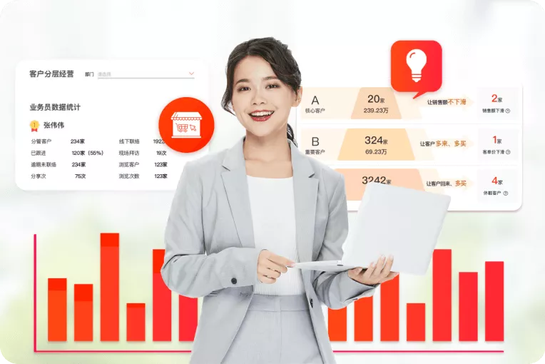 ●智能客户分析,核心/重要/普通客户分层运营,提产出、防流失;